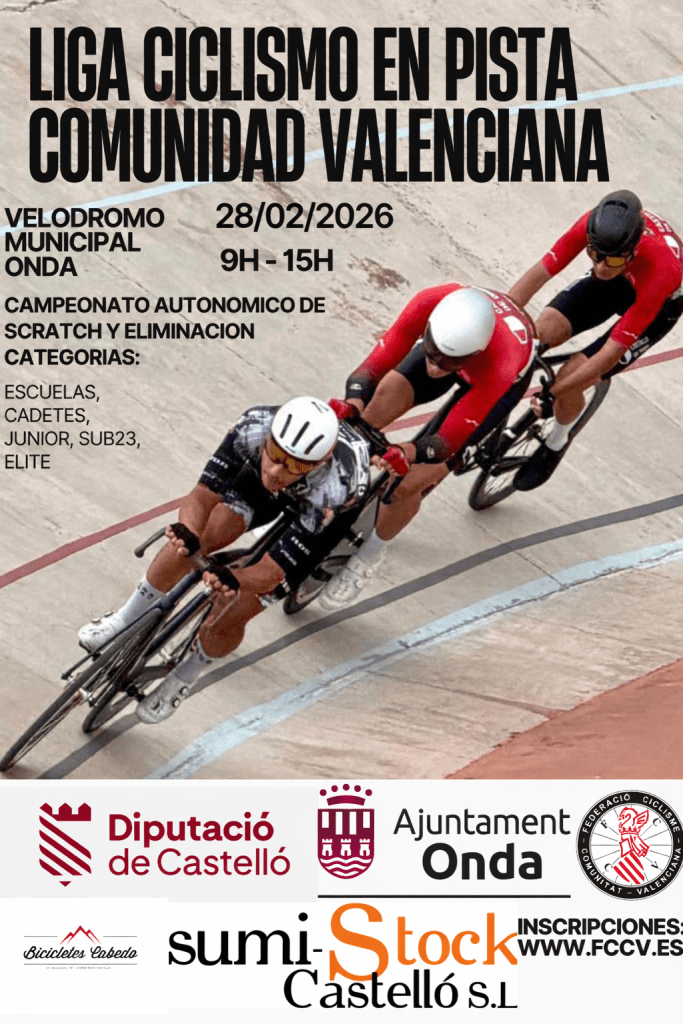 La Federació de Ciclisme de la Comunitat Valenciana informa de la apertura de inscripciones, para la jornada de Liga de Pista y Campeonato Autonómico de Pista de Scratch y Eliminación, que se celebrará el 28 de febrero en el Velódromo Municipal de Onda, organizado por el Club Ciclista Costa de Azahar Castellón.