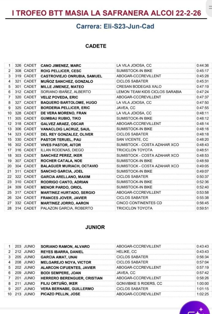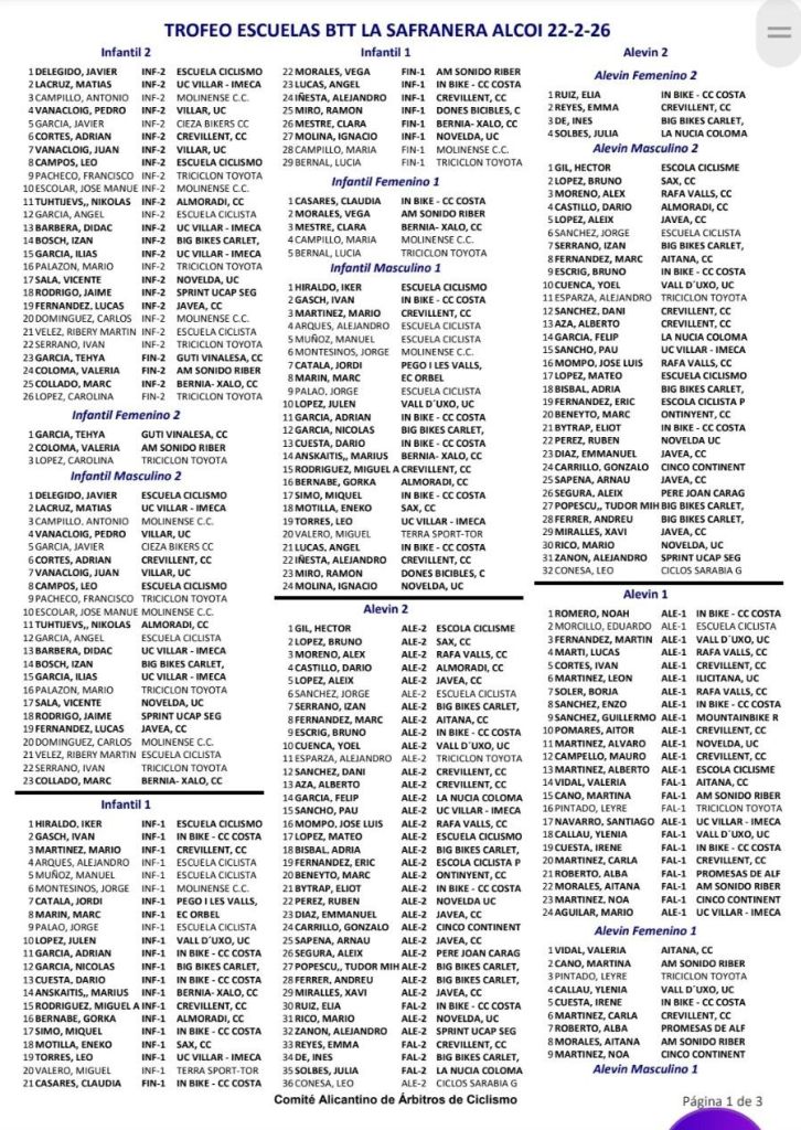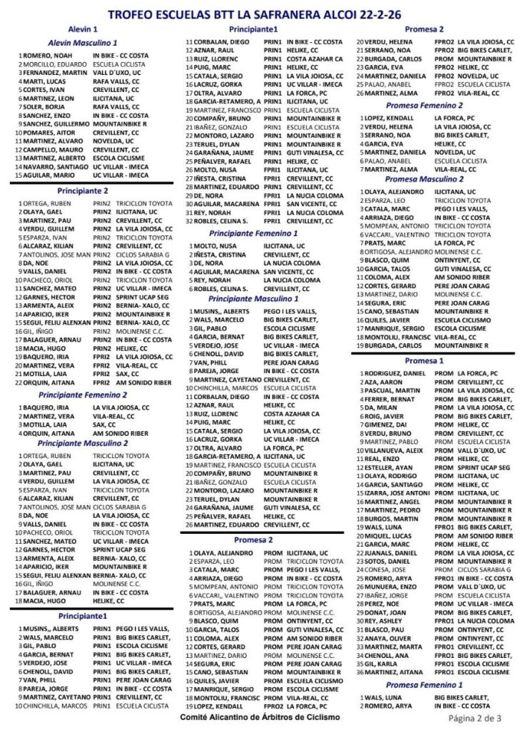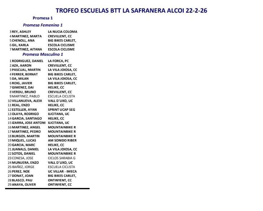 En Escuelas, victorias de Javier Delegido (Sabater) y Tehya García (Guti Vinalesa), en Infantiles 2; Iker Hiraldo (Sabater) y Claudia Casares (In Bike), en Infantiles 2; Noah Romero (In Bike) y Valeria Vidal (Aitana), en Alevines 1; Héctor Gil (Víctor Cabedo) y Elia Ruiz (In Bike), en Alevines 2; Alberts Musins (Pego) y Nusa Moltó (UC Ilicitana), en Principiantes 1; Rubén Ortega (Triciclón) e Iria Baquero (La Vila), en Principiantes 2; Daniel Rodríguez (La Forca) y Luna Wals (In Bike), en Promesas 1; Alejandro Olaya (UC Ilicitana) y Kendall López (La Forca), en Promesas 2.