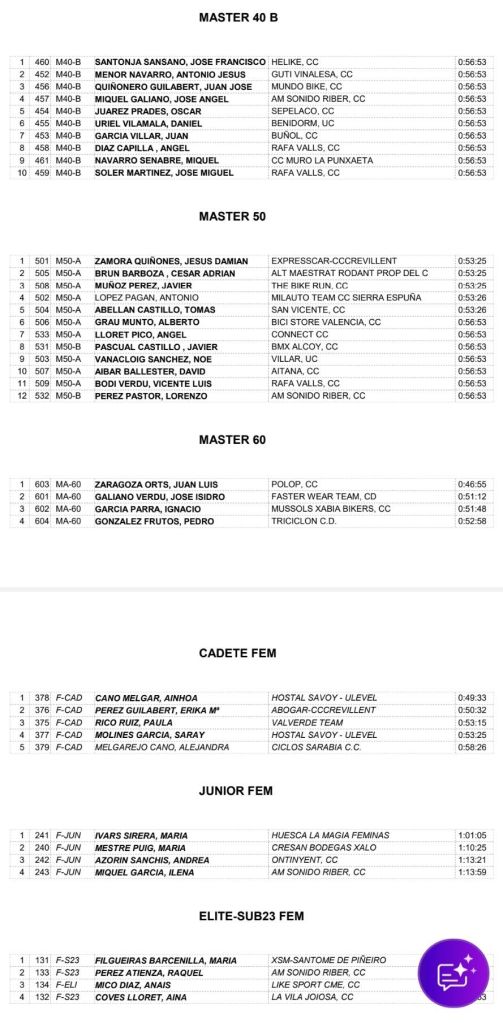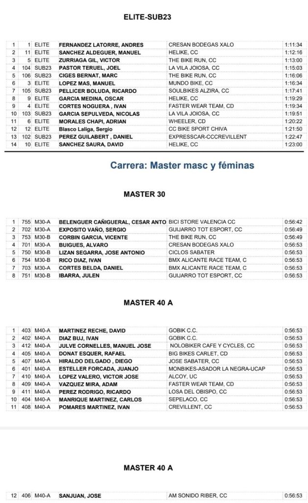 Mar Cano (La Vila) y Ainhoa Cano (Hostal Savoy Ulevel WTeam) se impusieron en la categoría Cadete; Álvaro Soriano (Abogar Crevillent) y María Ivars (Huesca La Magia) en Júniors; César Antonio Belenguer (Bicistore), en M30; David Martínez (Gobik), en M40A; José Francisco Santonja (Helike), en M40B; Jesús Damián Zamora (Expresscar Crevillent), en M50; Juan Luis Zaragoza (Polop), en M60; y María Filgueiras (Piñero) y Andrés Fernández (Cresan Bodegas Xaló, en Élite y Sub23 (Joel Pastor, de La Vila, y Raquel Pérez, del AM Sonido, fueron los mejores Sub 23). El Cresan Bodegas Xaló logro ser la mejor escuadra.