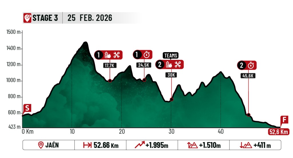 La tercera etapa, prevista para el miércoles 25 de febrero, trasladará el epicentro a Jaén, donde se desarrollará el tramo intermedio de la competición. Con salida en la Calle Bernabé Soriano y meta en el Olivo Arena, la jornada presenta un trazado de 52,55 kilómetros y +1.996 metros de desnivel, incluyendo la ascensión más dura de la edición. La subida inicial por Jabalcuz, con pista rota y rampas exigentes hasta su punto más alto, será el primer gran filtro. Después, la bajada técnica hacia la Solana abrirá paso a un segmento central de senderos estrechos, subidas cortas y explosivas, pasos de roca y descensos rápidos entre olivares, atravesando la zona de Jamilena antes de afrontar la gran ascensión. El cierre, por la Sierra del Neveral, promete bajadas largas y técnicas antes de la llegada al Olivo Arena.