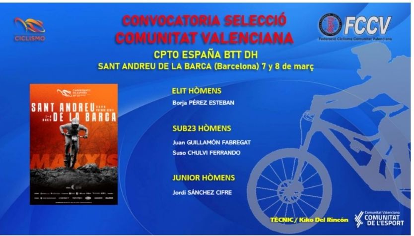 La Federació de Ciclisme de la Comunitat Valencia, a través del seleccionador de BTT, Kiko Del Rincón, han hecho pública la convocatoria de los deportistas que conformarán la Selección de la Comunitat Valenciana en el Campeonato de España de Descenso.