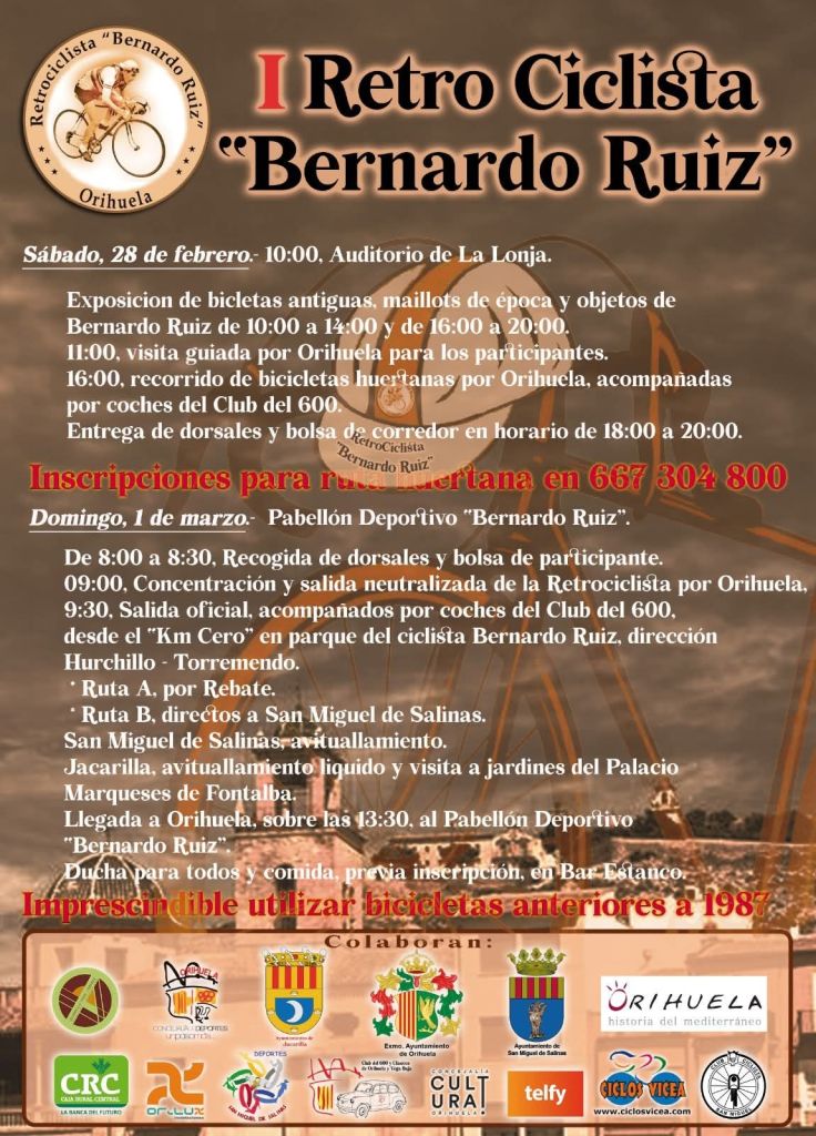 El sábado 28 de febrero el Auditorio de La Lonja acogerá una exposición abierta mañana y tarde con bicicletas antiguas, maillots históricos y objetos personales de Bernardo Ruiz cedidos por su familia, junto a material del Museo del Ciclismo de Bullas. La jornada incluirá una visita guiada y un recorrido de bicicletas huertanas por el casco histórico acompañadas por vehículos clásicos del Club del 600 y la Policía Local.
