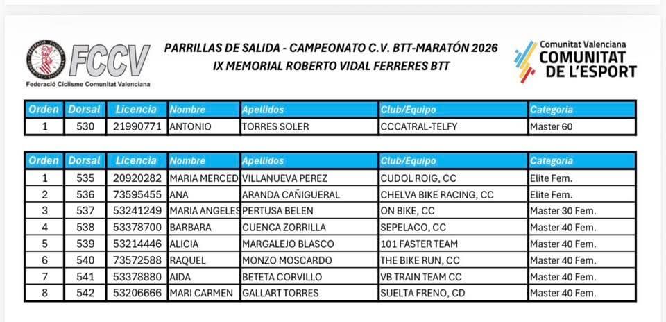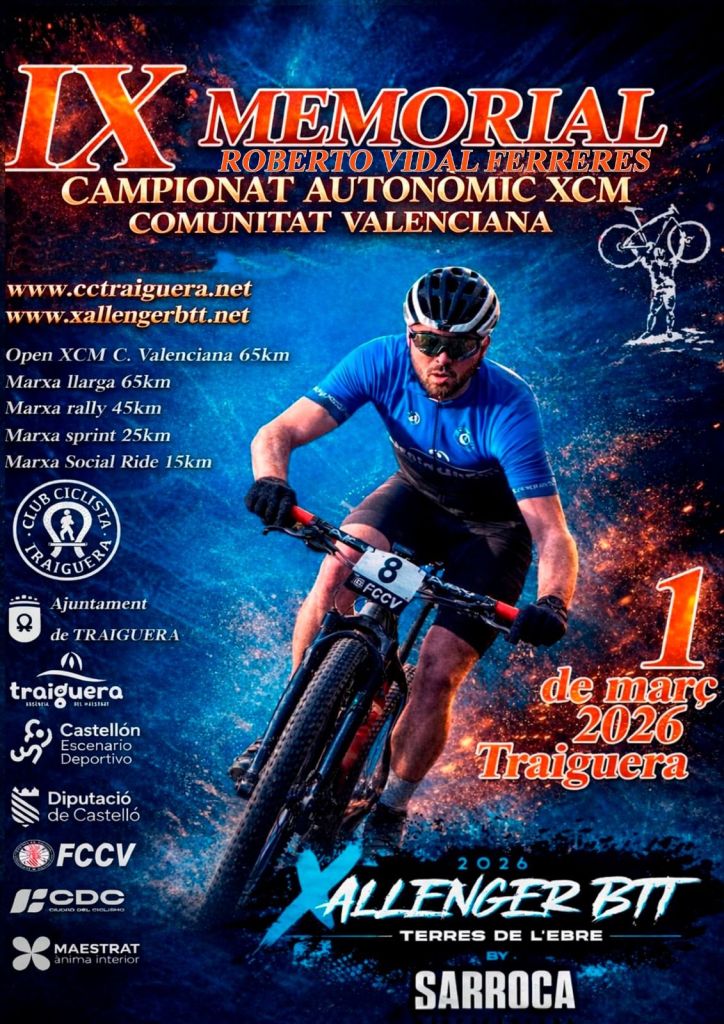 El IX Memorial Roberto Vidal Ferreres BTT será el domingo, 1 de marzo, el Campeonato Comunitat Valenciana BTT-Maraton. La prueba se disputa Traiguera (Castellón) a partir de las 8:30h. La organización de la prueba correrá a cargo de Traiguera CC.