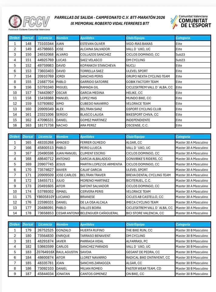 El listado de dorsales y parrillas de salida es el siguiente: