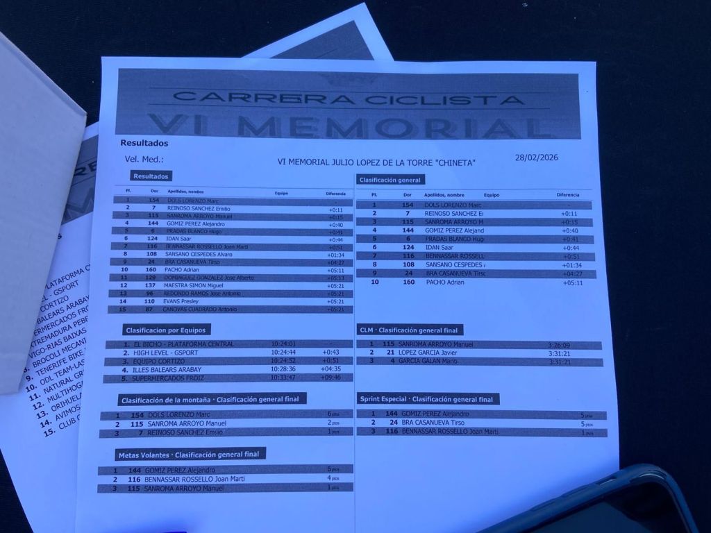 Victoria de Marc Dols (Illes Balears Arabay Cycling Team) en solitario en el VI Memorial Julio López de la Torre «Chineta». El corredor balear, tras un espectacular final, ha estado acompañado en el podio por Emilio Reinoso (El Bicho Plataforma Central) y Manuel Sanroma (Cortizo). Cuarta plaza de Alejandro Gómiz, que se ha adjudicado las Metas Volantes y los Sprints Especiales. Dols se ha llevado la Montaña y El Bicho Plataforma Central) ha sido la mejor escuadra.