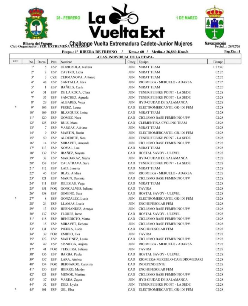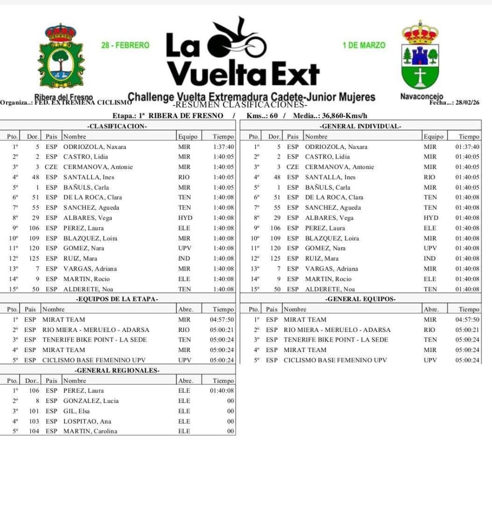Naxara Odriozola (Mirat Cycling Team) ha sido la ganadora de la primera etapa de la Vuelta Ciclista a Extremadura Femenina que se ha disputado en Ribera del Fresno y ha contado con 60 kilómetros de recorrido. Sus compañeras de equipo Lidia Castro y Antonie Casanova han completado el podio júnior. Quinta plaza de Carla Bañuls (Mirat Cycling Team).
