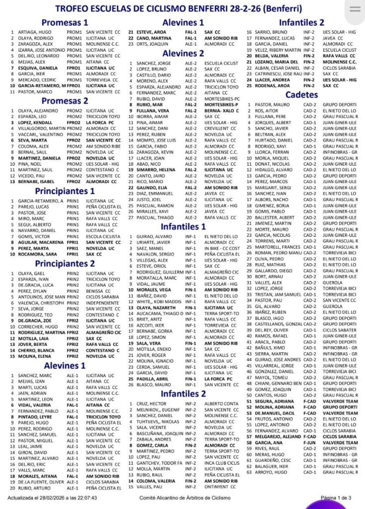 A nivel individual, Hugo Artiaga (San Vicente) y Daniela Esquiva (UC Ilicitana) se han impuesto en Promesas 1; Alejandro Olaya (UC Ilicitana) y Kendall López (La Forca), en Promesas 2; Adrián García-Retamero (UC Ilicitana) y Macarena Aguilar (San Vicente), en Principiantes 1; Gael Olaya (UC Ilicitana) y Zoé de Gracia (UC Ilicitana), en Principiantes 2; Marc Sánchez (UC Ilicitana) y Valeria Vidal (Aitana), en Alevines 1; Jorge Sánchez (Yecla) y Mar Rubio (Mortesbikes) en Alevines 2; Álvaro Guirao (El Nieto del Lobo) y Vega Morales (AM Sonido), en Infantiles 1; y Héctor Cruz (Alberto Contador) y Carla Gómez (Almoradí), en Infantiles 2.