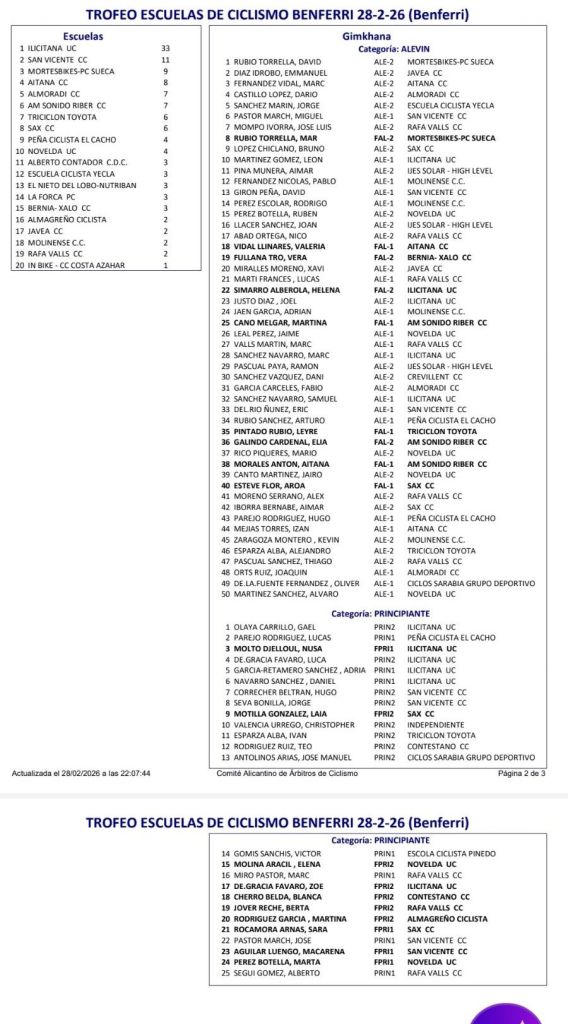 Benferri ha vivido hoy la primera prueba de la Challenge de Escuelas de Alicante de 2026. El Trofeo San Jerónimo ha visto el triunfo de la Unión Ciclista Ilicitana por delante del Club Ciclista San Vicente y del Mortesbikes PC Sueca. La escuadra de Elche ha empezado la temporada como terminó 2025, ganando.