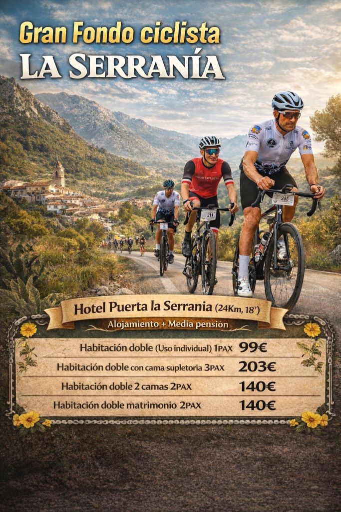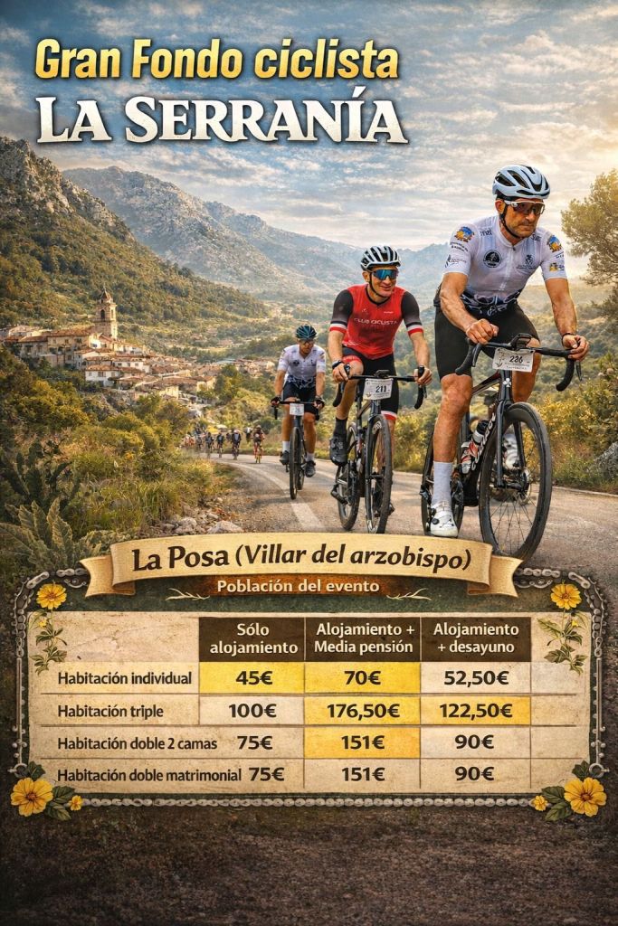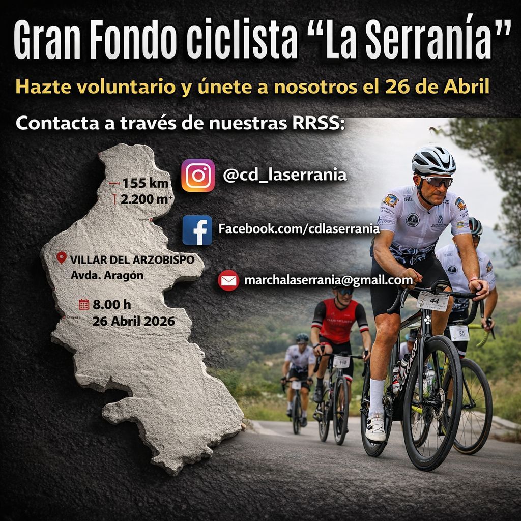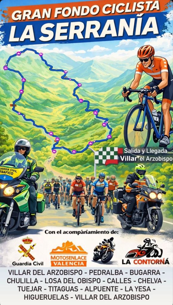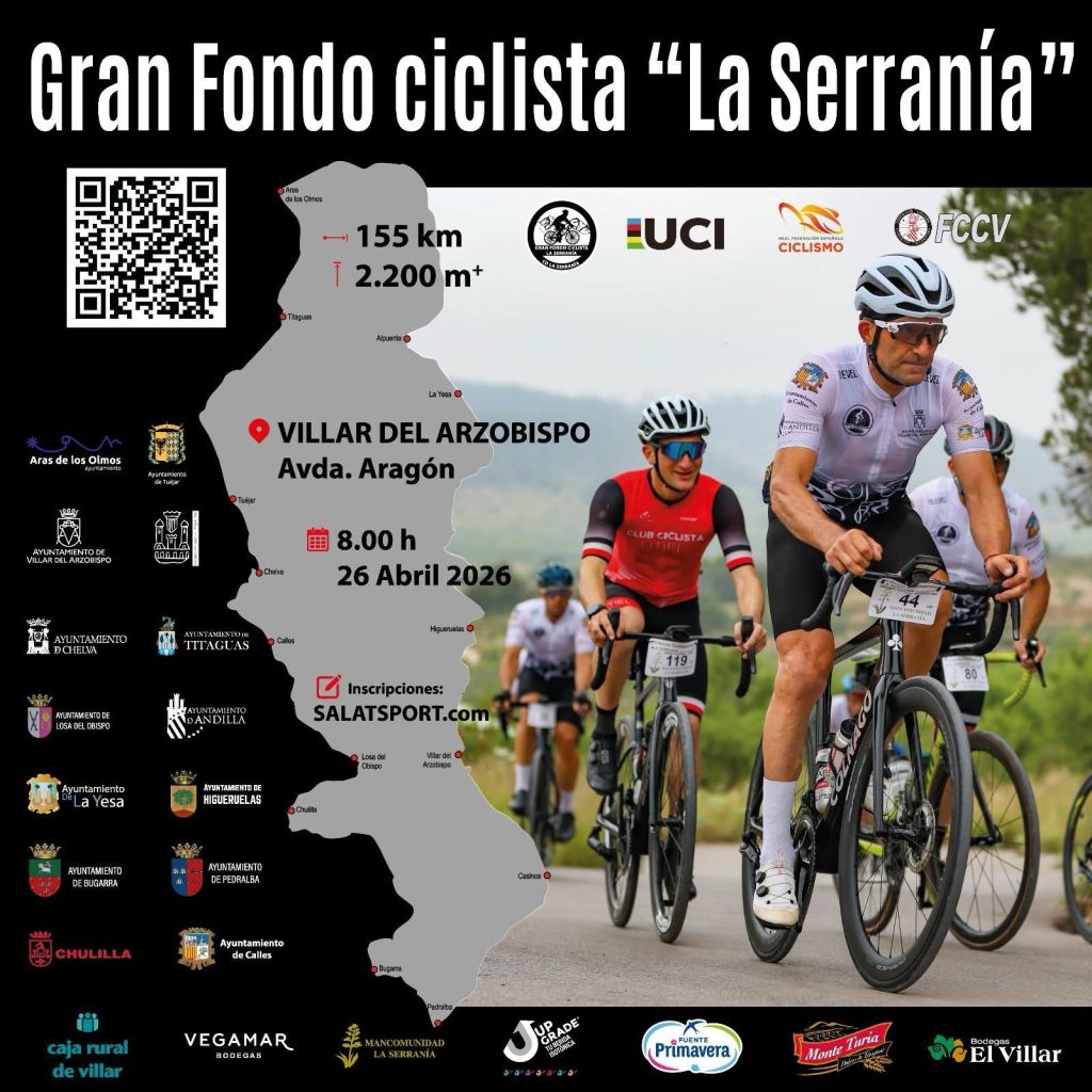 El Gran Fondo Ciclista La Serranía se celebrará el próximo 26 abril a las 8:00 con salida y llegada en Villar del arzobispo. Más de 250 deportistas se darán cita para disfrutar de una ruta ciclista en la comarca de Los Serranos, cerrada al tráfico en el transcurso de la cápsula de seguridad. Cabe destacar, que la inscripción con MAILLOT finalizará el próximo domingo 15 de marzo.