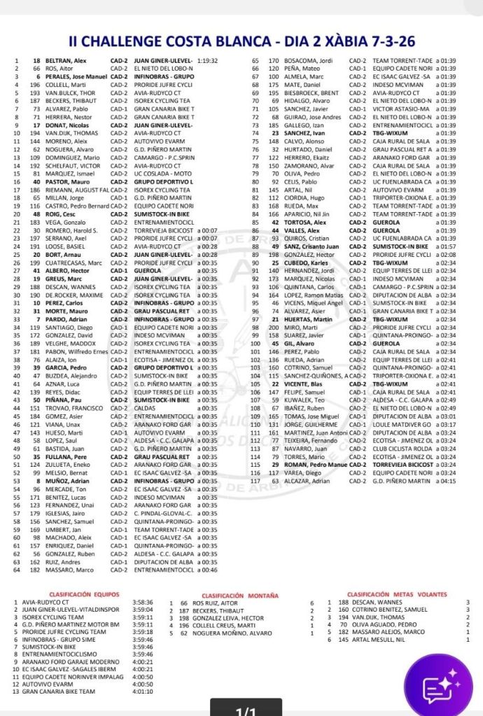 - Etapa 1 (6 marzo, 2026): Altea. CRI. 5.4Km. Clasificaciones