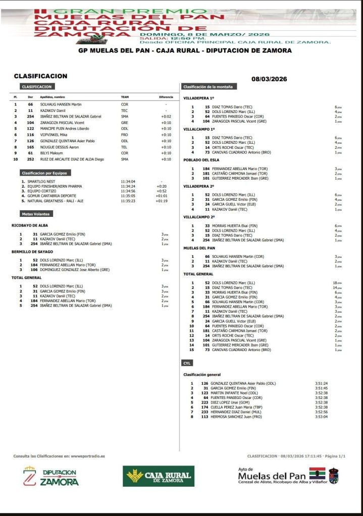 El noruego Martin Solhaug remató el gran trabajo realizado por su equipo, el Cortizo, para llevarse la victoria en la 89 edición del Trofeo Muelas del Pan que congregó este domingo este domingo en tierras zamoranas a un pelotón integrado por 29 equipos nacionales de la categoría Elite y Sub 23. El equipo gallego neutralizó el ataque de Ekai Morras (Finisher) en la última ascensión a Villalcampo y al paso por Ricobayo lograron unos metros de ventaja Gabriel Ibáñez (Smartlog), Daniil Karazov (Bembibre) y Martin Solhaug a los que ya no pudieron alcanzar el resto de destacados en la última ascensión al Poblado del Esla. Cuarta plaza para Vicent Zaragoza (Natural Greatness Rali Alé). Marc Dols (Baleares) ha ganado las Metas Volantes y la Montaña. AVANCE