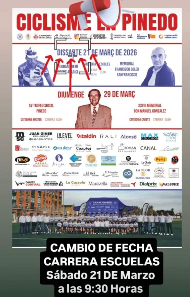 El Club Ciclista Vicente Aparicio Vila y la Peña Ciclista Pinedo afrontan dos fines de semanas en el que el ciclismo será el protagonista. El próximo día 21 de marzo, de la mano del Club Ciclista Vicente Aparicio Vila, las protagonistas serán Escuelas con la disputa del VII Gran Premi Vicent Aparici – Memorial Francisco Soler Sanfrancisco, prueba que en principio estaba fijada para el 22 de marzo y se adelanta una jornada. La competició comenzará a las 9.30 horas. Además de la carrera, se ha programado una entretenida gymkana, en las inmediaciones de la zona de salida.