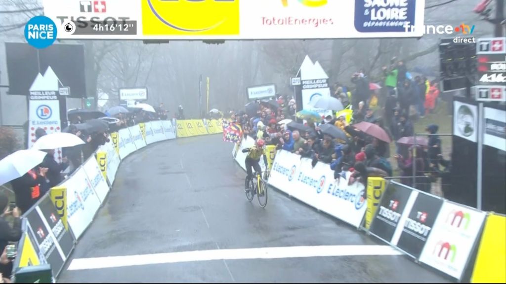 Jonas Vingegaard ganó la caótica cuarta etapa de la París-Niza. Después de que muchos de sus rivales se hubieran quedado atrás debido a caídas, mala suerte y escalones, el danés derrotó a Daniel Felipe Martínez y Tim van Dijke en la subida final . El maillot amarillo, Juan Ayuso, sufrió una caída y se vio obligado a abandonar la carrera con fuertes dolores.