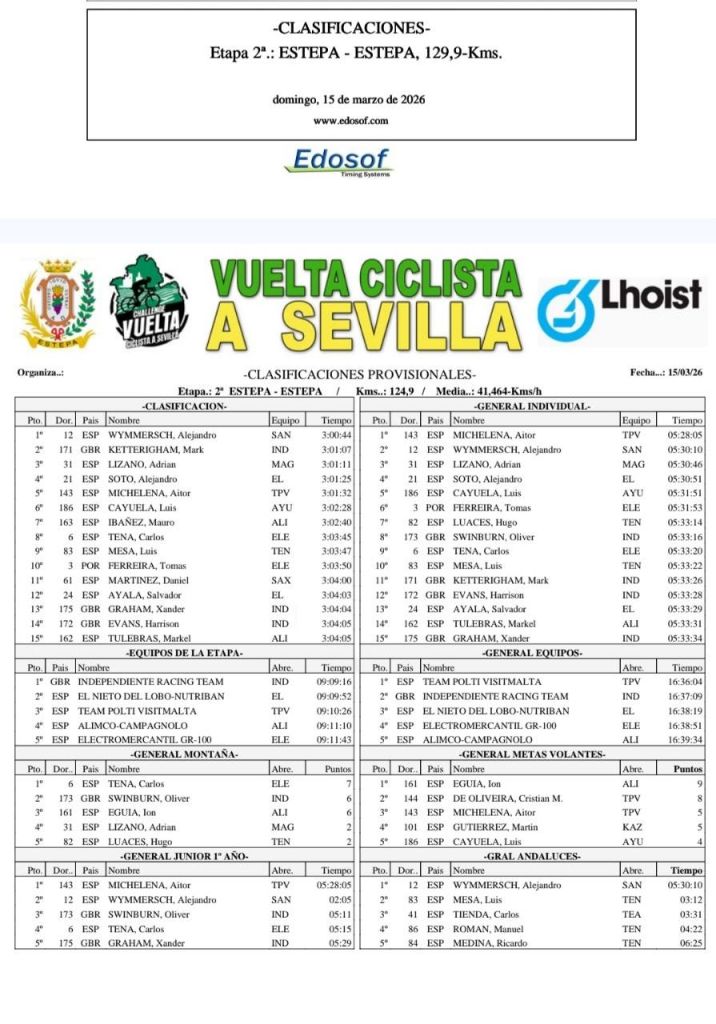Etapa 2. Domingo, 15 de marzo. Estepa. 10.00 horas. Clasificaciones
