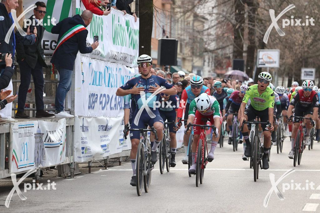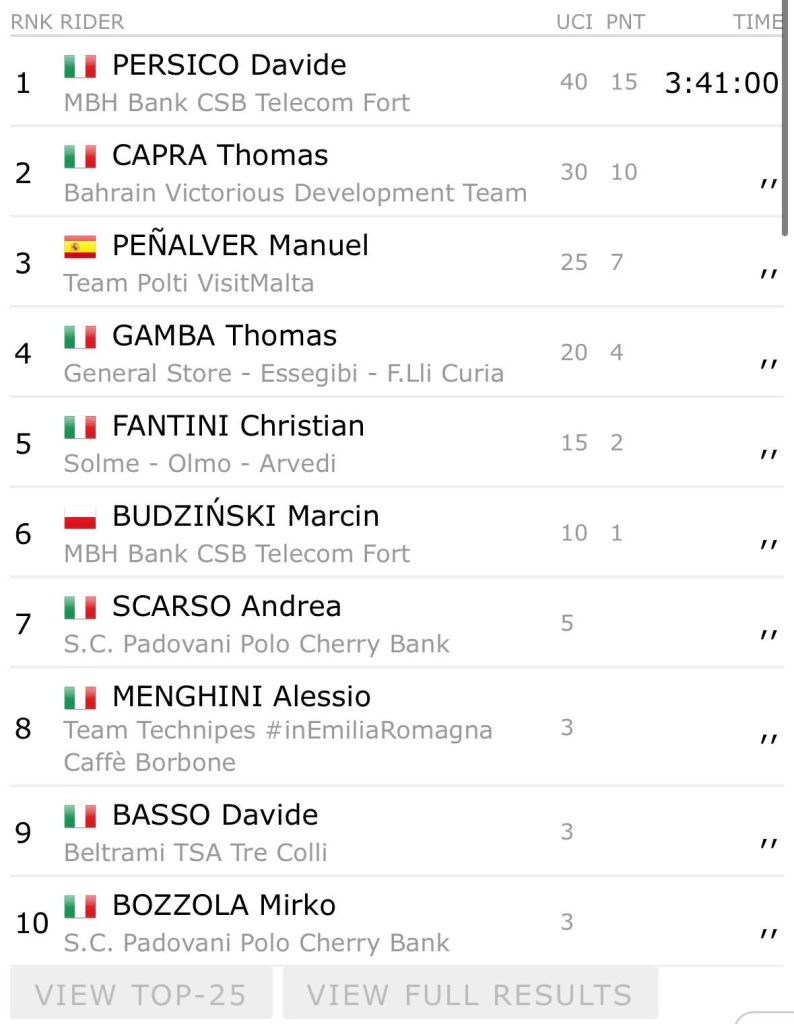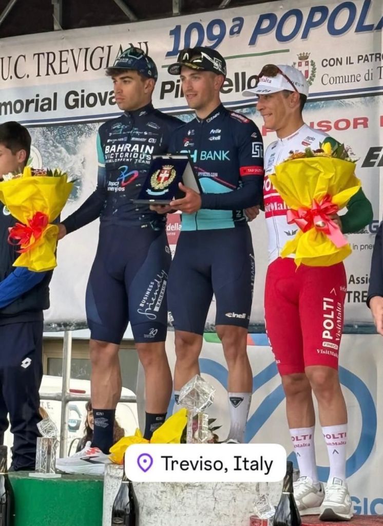 En Treviso, tras la neutralización de tres fugados a 7 kilómetros de meta, la volata del grupo en la Popolarissima ganada por Persico vio a Thomas Capra (Bahrain) terminar segundo y a Manuel Peñalver (Polti VisitMalta), tercero. El torrevejense estuvo muy cerca del triunfo y demostró su potencial.