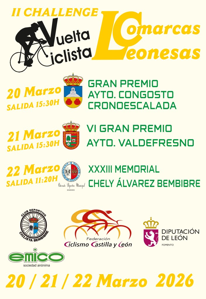 La segunda edición de la Challenge Vuelta Ciclista a las Comarcas Leonesas se disputa los días 20, 21 y 22 de marzo, una prueba de carretera para ciclistas Júnior organizada por el Club Deportivo Bembibre Ciclista que discurre por varios municipios de la provincia de León y en la que el Bierzo tiene un papel central. En la salida estarán los equipos Lucta Granja Rinya (Asier Fortea, Bru Hueso, Jorge Flores, Manuel Belrán, Miguel Navarro y Rubén Benavent) y Guerola-CC Ontinyent (Borja Giménez, Jorge Alarcón, Federico Velázquez, Beltrán Raso, Iván Buleo y Joan Sanchis).