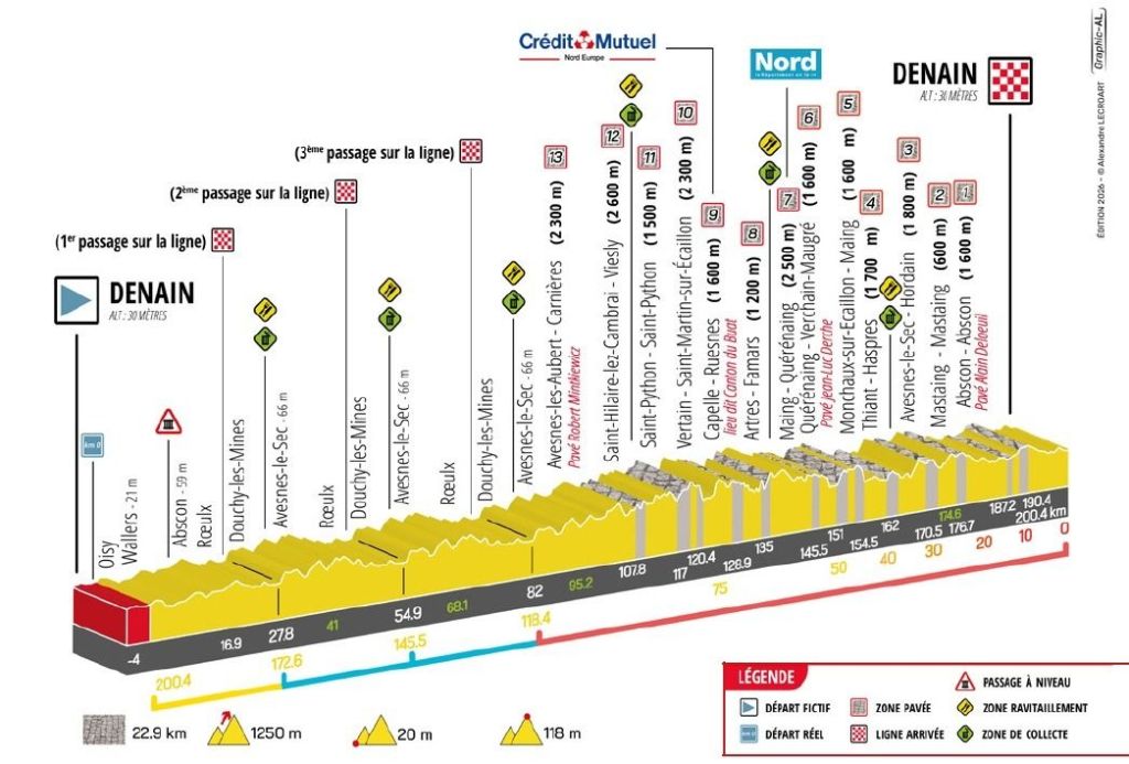Propone un trazado de 200,4 kilómetros alrededor de la localidad de Denain, con un total de 13 sectores de pavé, algunos de ellos compartidos con la París-Roubaix, en una combinación pensada para favorecer la dureza y la selección.