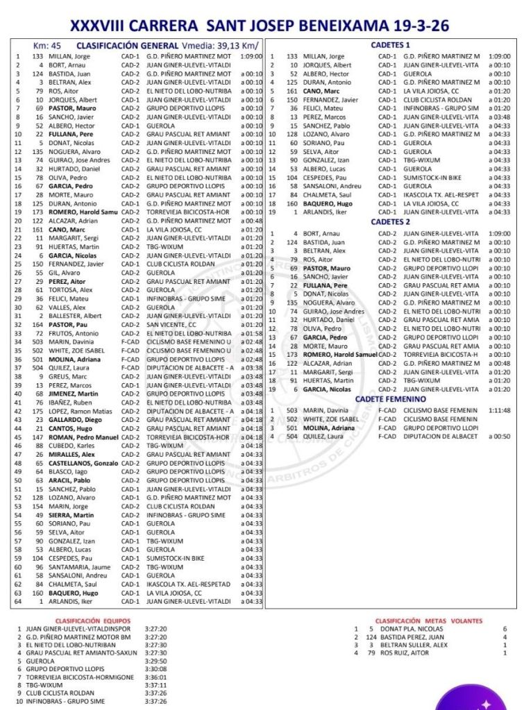 Jorge Millán (GD Piñero) ha sido el ganador de la XXXVIII Carrera Sant Josep para corredores Cadetes disputado esta mañana en Beneixama. Arnau Bort (Juan Giner Ulevel Vitaldinsport) ha entrado segundo, con el mismo tiempo del ganador. Tercera plaza de Juan Bastida (GD Piñero), que ha accedido a meta a 10 segundos del dúo inicial dando tiempo al grupo inicial. Arnau Bort ha sido el mejor Cadete de segundo año, Nicolás Donat (Juanginer-Ulevel Vitaldinsport) se ha llevado las MV y el equipo Cadete de la PC Pinedo fue la mejor formación. Triunfo de Davinia Marín (UPV), en féminas.