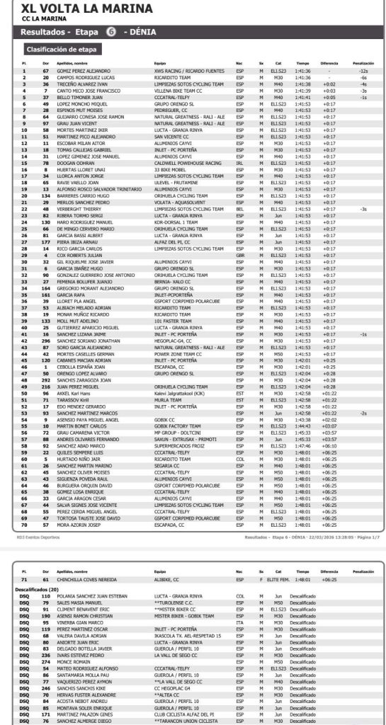 Etapa 3. 1 de febrero de 2026. Parcent. 10.30h. 72,4Km. Clasificaciones