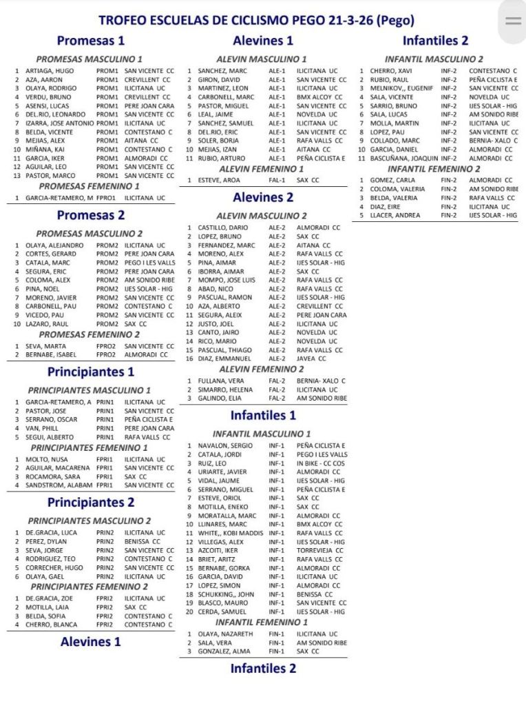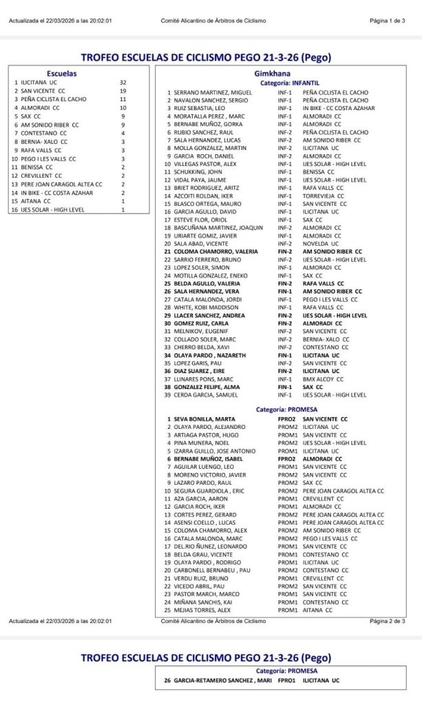 22/03 Trofeu Vila de Pego de Escuelas. Clasificaciones