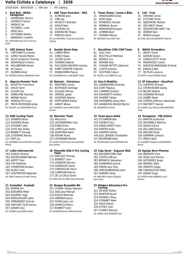 Esos tres son la principal terna, pero no los únicos a tener en cuenta. El inglés Tom Pidcock (Pinarello) viene dispuesto a ponerles las cosas difíciles a los otros en su primera participación en la ronda catalana. Otros llamados a animar la clasificación general son el colombiano Egan Bernal, al frente del Ineos-Grenadiers; el ecuatoriano Richard Carapaz, del EF Education First. Entre los españoles, las aspiraciones pasan por Enric Mas (Movistar Team) y Mikel Landa (Soudal Quick Step). A todos ellos, cabe añadir una nómina de corredores con piernas como para animar las etapas, así como la clasificación general, como los gregarios de Evenepoel en Red Bull, el alemán Florian Lipowitz y el australiano Jay Hindley, el británico del Ineos Oscar Onley, el veterano Nairo Quintana para escoltar a Enric Mas en el Movistar o el británico Tao Geoghegan Hart, del Lidl-Trek, entre otros.