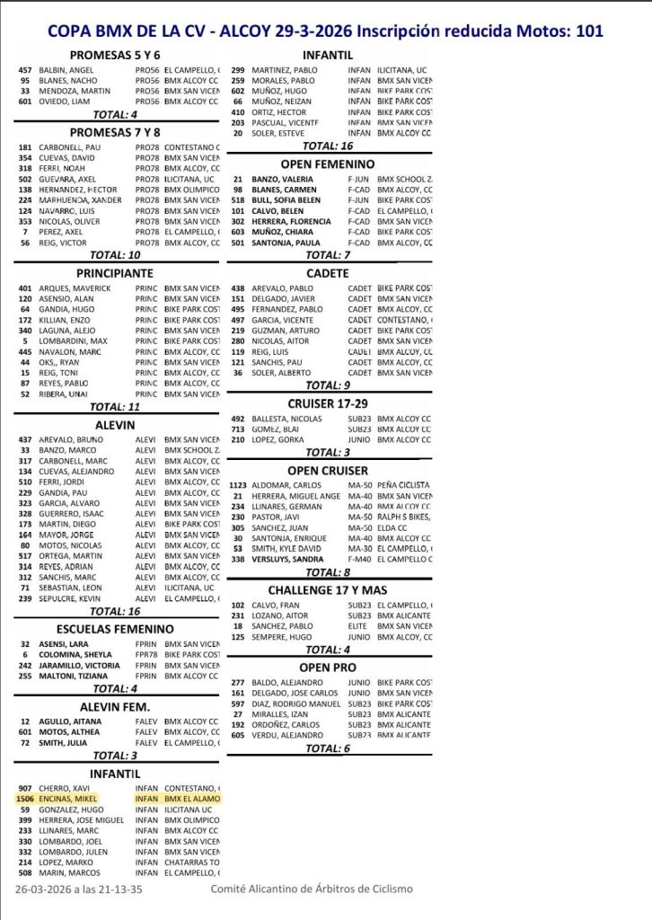 Llegan como líderes a la competición alcoyana Liam Oviedo (BMX Alcoy), en Promesas 5 y 6; Axel Pérez (El Campello), en Promesas 7 y 8; Ryan Oks (BMX San Vicente) y Victoria Jaramillo (BMX San Vicente), en Principiantes; Roland Baranovskis (Almuñecar) y Julia Smith (El Campello), en Alevines; Xavi Cherro (Contestano), en Infantiles; Kyle David Smith (El Campello), en Open Cruiser; Juan Vicente Giner (El Campello), en la Challenge 17 y más; Jens Lauwers (Verlu BMX), en Open Pro Júnior; Carlos Ordóñez (BMX Alicante), en Open Pro Sub 23; Florencia Herrera (BMX San Vicente), en Open Femenino; y Vicente García (Contestano), en Cadetes.