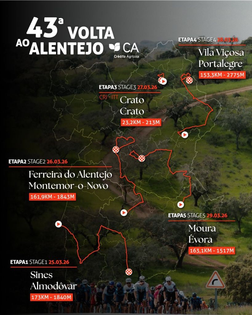 La competición, que continúa consolidándose como uno de los eventos más emblemáticos del calendario ciclista portugués, dará su salida inaugural este miércoles en Sines, con destino a Almodôvar (173,7 km). La segunda etapa unirá Ferreira do Alentejo con Montemor-o-Novo (161,9 km) y la tercera será una contrarreloj individual (23,9 km) en Crato. La cuarta etapa une Vila Viçosa con Serra de São Mamede, en Portalegre (153,3 km), con llegada en alto en la que será la etapa reina de esta edición. El domingo, Évora acogerá de nuevo la conclusión de la carrera, tras 163,1 km con salida en Moura.