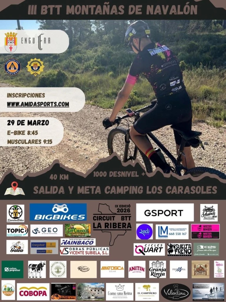 El próximo domingo, 29 de marzo, se disputa la III Marcha BTT Montañas de Navalón, prueba puntuable para el Circuit BTT La Ribera. La salida y meta estarán situadas en el Camping Los Carasoles y el banderazo de salida de los musculares será a las 9.15. Llega como líder Héctor Molla. El viernes, a las 10 horas, se cierran las incripciones. Se pueden realizar en este enlace: WWW.AMIDASPORTS.COM