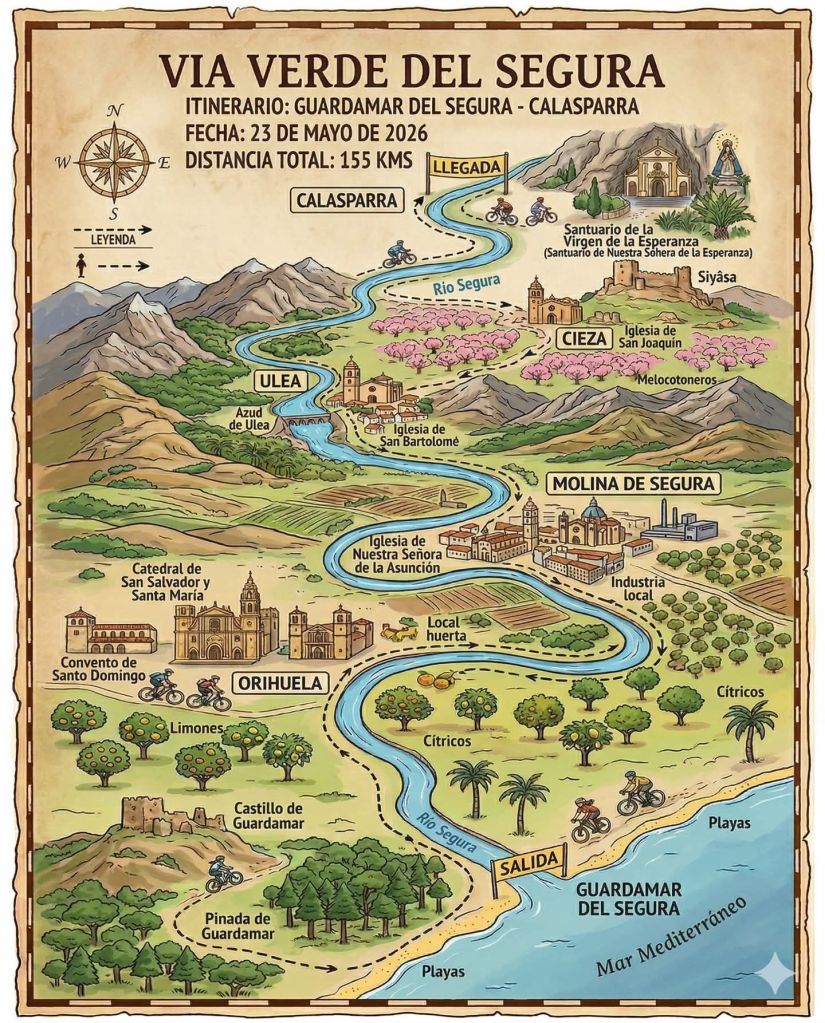 Reto Ciclista 2026: Vía Verde del Segura. El Mountain Bike Guardamar ya tiene fecha oficial para su gran aventura sobre ruedas. El próximo 23 de mayo tienen previsto cruzar el corazón de la región en un recorrido inolvidable que partirá de Guardamar del Segura y tendrá su meta en el Santuario de la Virgen de la Esperanza de Calasparra. En total 155 Kilómetros de recorrido con un desnivel positivo de 1.200 metros. Un desafío para valientes.