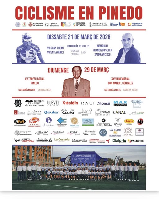 Pinedo vuelve a vivir este domingo una nueva jornada en la que el ciclismo es protagonismo. Si el pasado 21 de marzo los más pequeños disfrutaban del VII Gran Premi Vicent Aparici – Memorial Francisco Soler Sanfrancisco, dedicado a las Escuelas, ahora toca, este domingo, una prueba social y otra de Cadetes serán el atractivo principial de una gran número de ciclista en la localidad valenciana. El espectáculo comenzará a las 9 de la mañana con el XV Trofeo Social y, posteriormente, a las 10.30 horas, se pondrá en juego el XXVIII Memorial Don Manuel González para ciclistas Cadetes. El espectáculo está asegurado. La salida y meta estarán situadas en la Travesía Pinedo al mar.