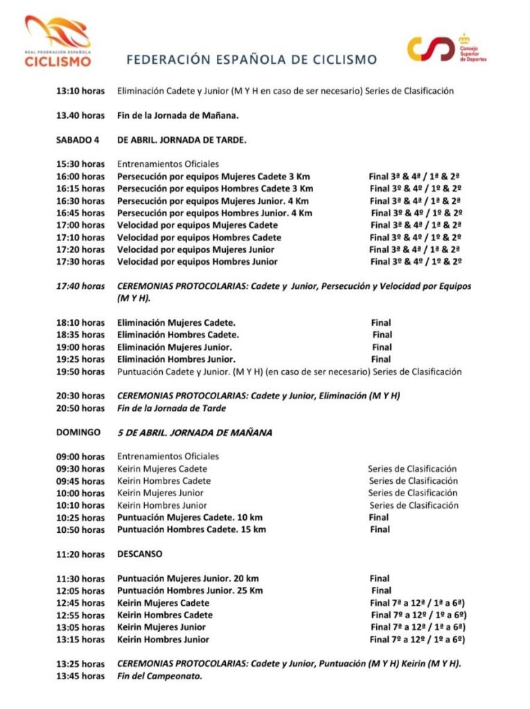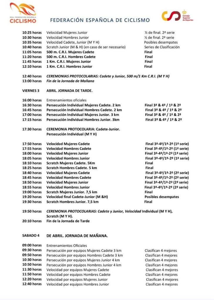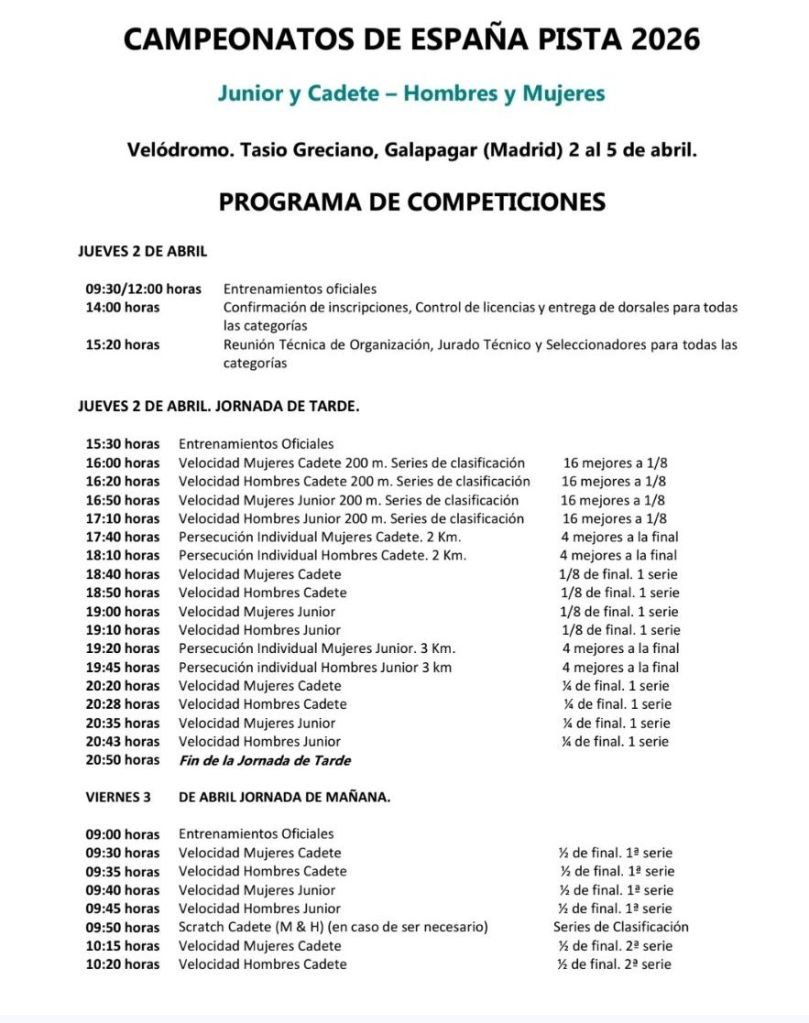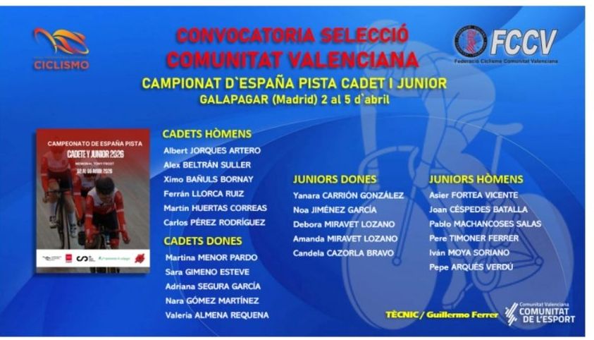 La Federació de Ciclisme de la Comunitat Valencia competirá del 2 al 5 abril en el Campeonato de España de Pista Cadete y Júnior de Galapagar. El seleccionador Guillermo Ferrer ha confeccionado una lista de ciclistas de un gran nivel que aspiran a copar todos los podios.