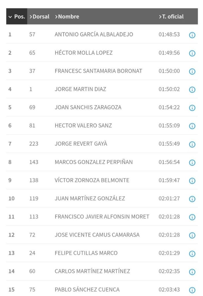 Anna Fayós y Francesc Santamaría han vencido en la categoría Élite; Jorge Revert y Clara Almendros, en Sub 23; Ana María Blasco y Antonio García, en M30; Marcos González y María José Vaño, en M40; Felipe Cutillas y Teresa Santamaría, en M50; Ximo Casal, en Veteranos; Pablo Benardini, en Cadetes; y Diego Alcañiz, en Júniors.