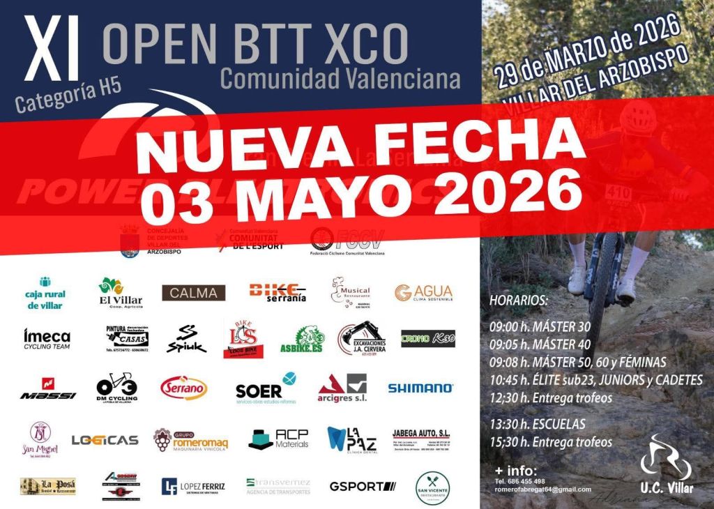El Gran Premio La Serranía Power Electronics que se suspendió el domingo en Villar del Arzobispo «debido a las alertas de vientos huracanados y por la seguridad de todos los participantes» ya tiene nueva fecha. La prueba, puntuable para el Open BTT CXO CV, se disputará el domingo 3 de mayo.
