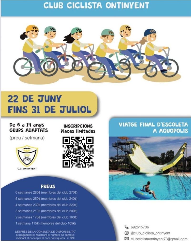 El Club Ciclista Ontinyent organiza una «Escuela de Verano», del 22 de junio al 31 de julio, en horarios de 9 a 13.30 horas, en el Poliesportiu de la localidad valenciana. Esta dirigida a niños de 6 a 14 años, incluido un grupo de adaptados.