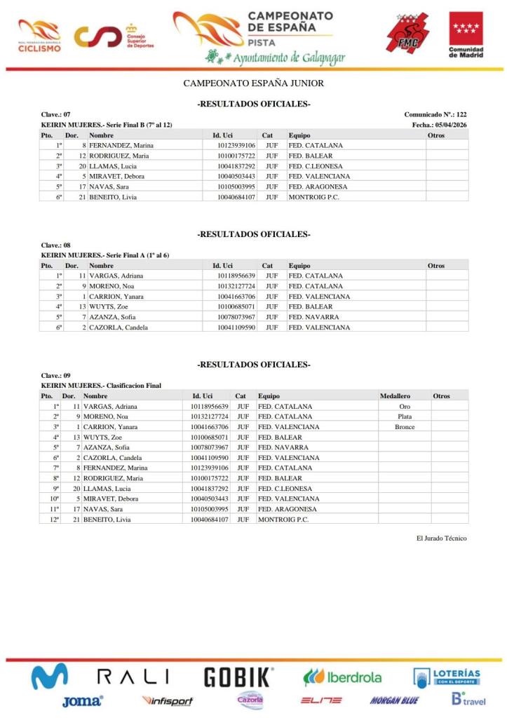 La catalana Adriana Vargas se lleva el oro en el Keirin Júnior masculino, con Noa Moreno segunda y la valenciana Yanara Carrión, tercera y medalla de bronce.