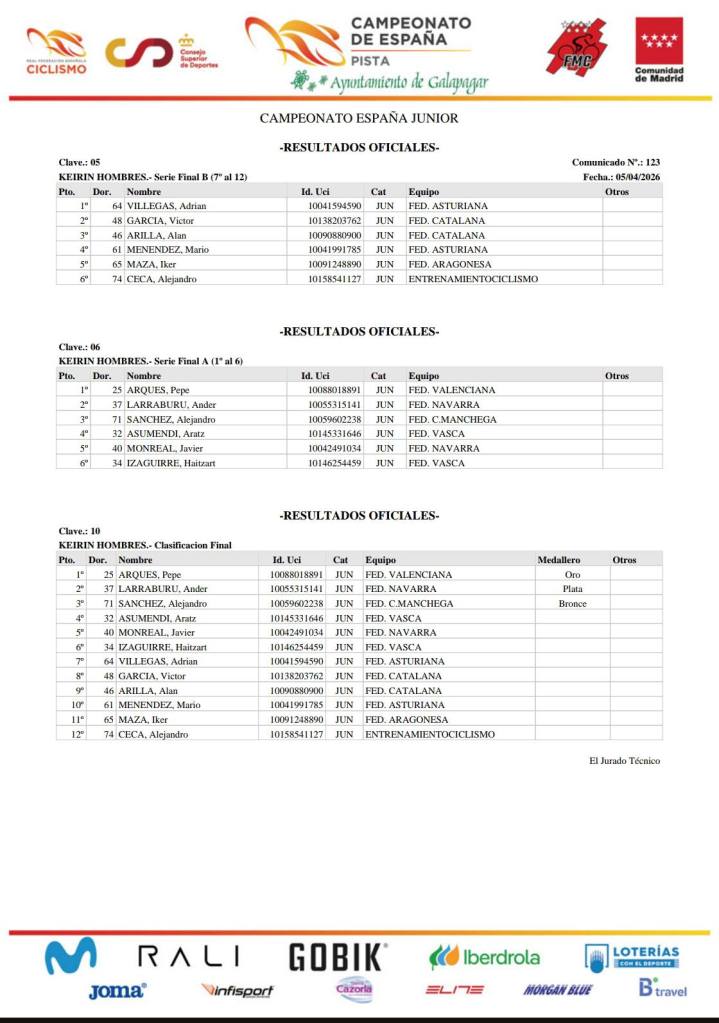 Pepe Arques ha sumado esta mañana en Galapagar su tercera título de campeón de España. En esta ocasión lo ha hecho en Keirin superando a Ander Larruburu y Alejandro Sánchez. Tras ganar en Velocidad Individual en la categoría Júnior y repetir en el 500 metros CRI ha vuelto a subir a lo más alto del podio en Keirin.