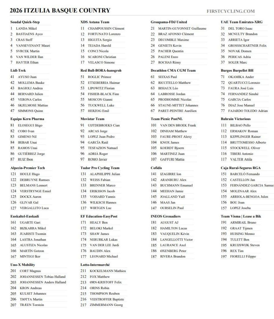 El duelo que centra el foco es el que protagonizarán Isaac del Toro (UAE) y Juan Ayuso (Lidl Trek). El de Jávea reaparece después de la caída que sufrió en la París Niza. Antes del percance había despegado con triunfo de etapa y general en el Algarve. En el recuerdo su triunfo en la Itzulia 2024, pero su idea es renovar laureles en un año que debe ser de confirmación.