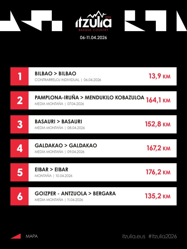 La Itzulia 2026 se pone en marcha hoy lunes con un cartel de lujo donde destaca el duelo estelar entre el alicantino Juan Ayuso y el mexicano Isaac del Toro, principales favoritos para una prueba que incluye 6 etapas intensas en un recorrido con 29 puertos puntuables y más de 16.000 metros de desnivel en total. De lunes 6 al sábado 11 no habrá respiro, se abren las emociones a través de 809 km. Los puertos, 4 de primera, 7 de segunda y 18 de tercera serán el escenario de la gran batalla en la lucha por la txapela.