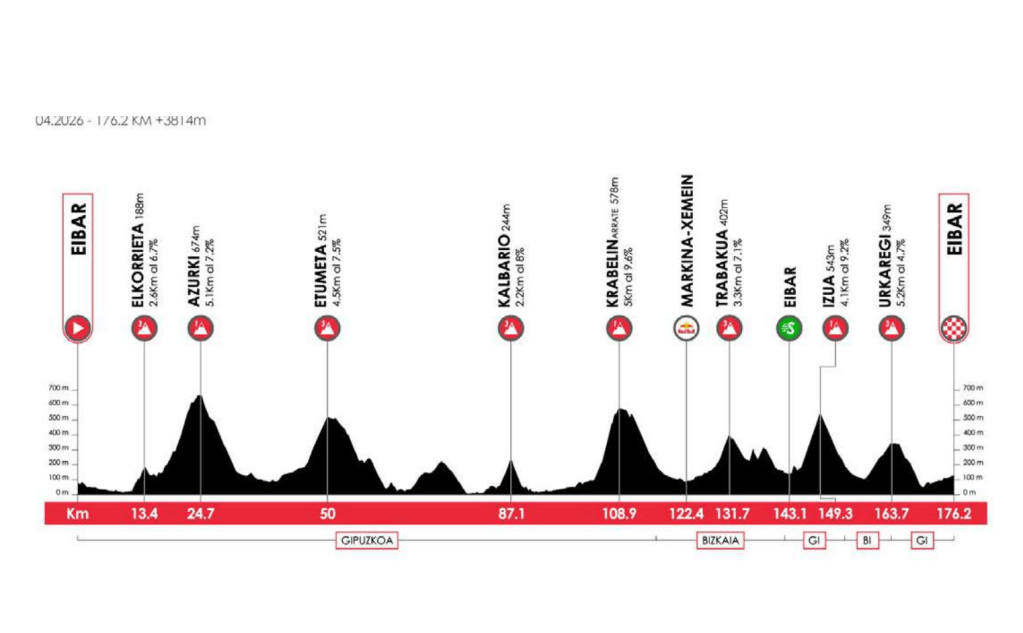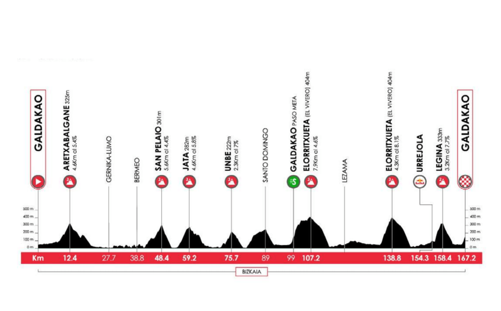 El jueves día 9 Galdakao tendrá el protagonismo con salida y meta. Esperan 167,2 km de recorrido y 3.200 metros de desnivel, lo que aportará más fatiga al pelotón.