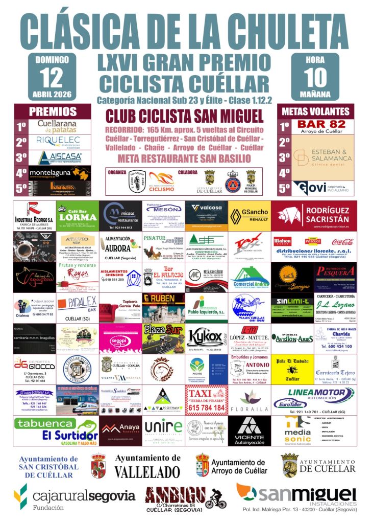 LXVI Clásica de la Chuleta – Gran Premio Ciclista Cuéllar | Cuéllar – Cuéllar| 159.5 km | Domingo, 12 de abril – 10:00h