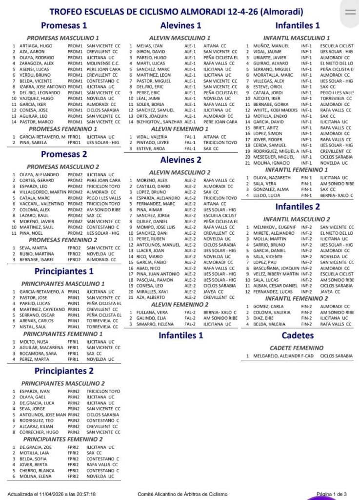 28/02 Trofeo Escuelas de Ciclismo de Benferri. Clasificaciones