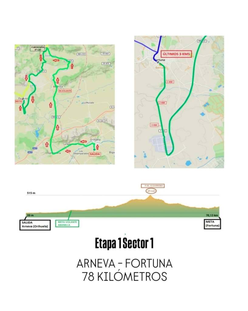 La primera etapa cuenta con dos sectores. El primero saldrá de Arneva rumbo a Fortuna, epicentro de esta edición, con el Puerto del Algarrobo como punto caliente del primer sector. El segundo sector será una CRI clave para la lucha por la general, creando diferencias entre los ciclistas.