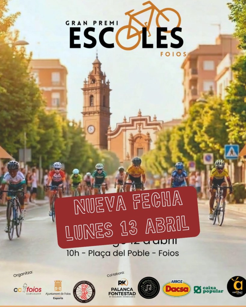 El Gran Premi Escoles Foios se disputa esta mañana, a partir de las 10 horas. La prueba es puntuable para la Challenge de Ciclismo de Valencia. Estaba prevista disputarse el domingo y se decidió trasladarla al lunes por las previsiones meteorológicas adversas.