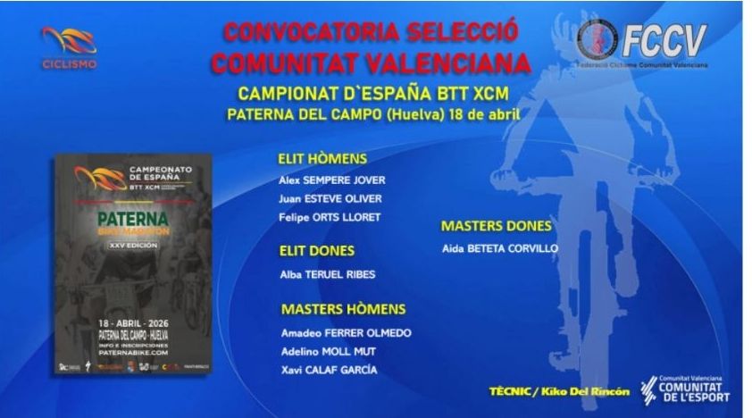 La Federació de Ciclisme de la Comunitat Valencia a través del seleccionador de BTT Kiko del Rincón, hacen pública la convocatoria de los siguientes deportistas que conformarán la Selección de la Comunitat Valenciana en el Campeonato de España BTT Maratón.