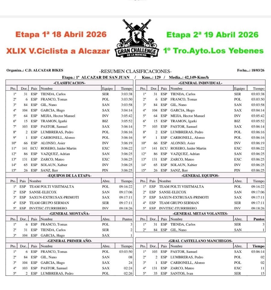 Carlos Tienda (Grupo Serman) ha ganado en solitario la primera etapa de la Challenge de La Mancha, la XLIX Vuelta Ciclista a Alcázar que ha contado con 129 kilómetros de recorrido. Tomás Franco (Polti) ha entrado segundo y Nuno Gil (Sanse), tercero. Séptima plaza de Samuel Pastor (Saxun Extrusax-Primoti), primer corredor de Castilla-La Mancha.