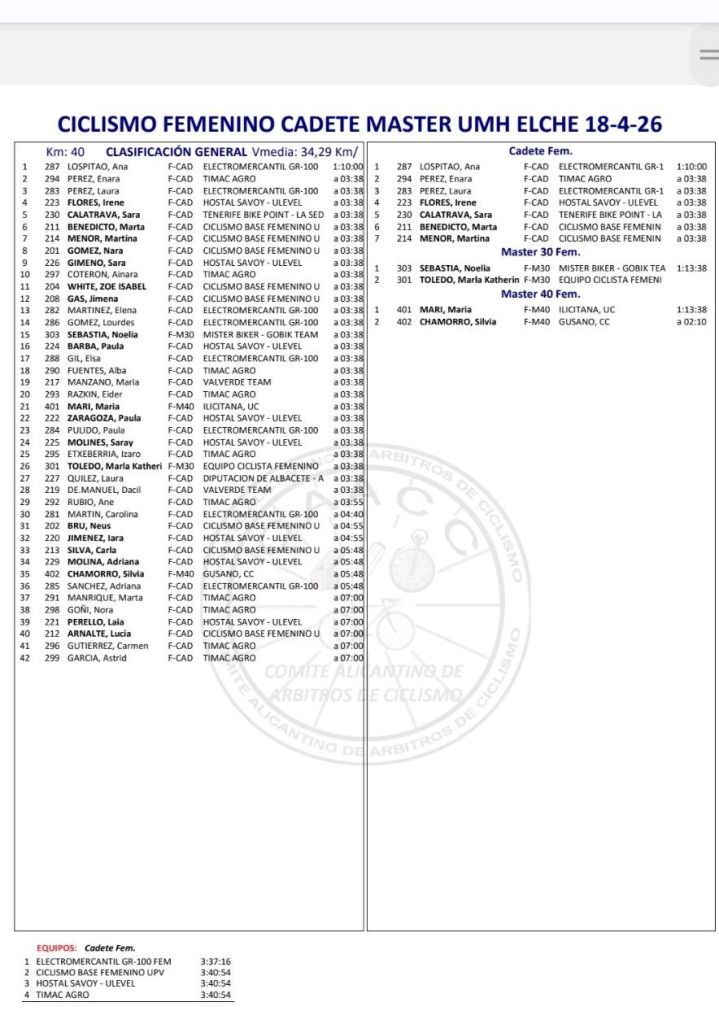 En Cadetes, triunfo de Ana Lospitao (Electromercantil GR-100) por delante de Enara Pérez (Timac Agro) y de Laura Pérez (Electromercantil GR-100). Cuarta plaza para Irene Flores (Hostal Savoy Ulevel WTeam). En M30, victoria de Noelia Sebastiá (Mister Biker) y de María Mari (UC Ilicitana), en M40. El Electromercantil ha sido la mejor formación