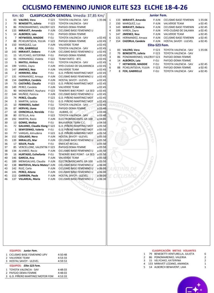 Julieta Benedetti se ha llevado las Metas Volantes; el Toyota Valencia SAV ha sido el mejor equipo Élite-Sub23; y el Ciclismo Base Femenino UPV se ha impuesto en la categoría Júnior.