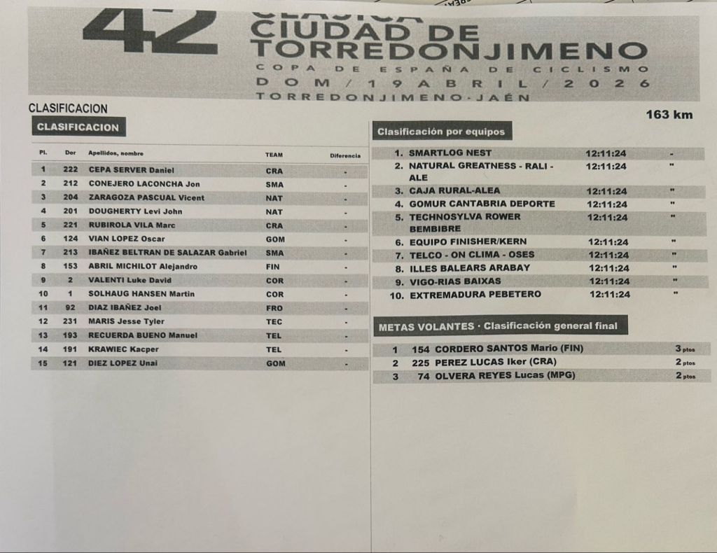 Triunfo al sprint de Dani Cepa (FilialCajaRural) en la Clásica Ciudad de Torredonjimeno «Copa de España de Ciclismo». El ciclista alicantino ha logrado de esta forma su segunda victoria en el certamen 2026 tras su triunfo en el Trofeo Guerrita. Tercera plaza del vilero Vicent Zaragoza (Natural Greatness Rali Alé).