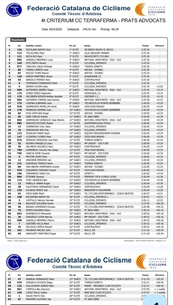 Oriol Escolano (GR Bikes) ha sido el ganador del IV Critérium CC Terraferma Prats Advocats. Marc Tellez (Illes Balears) fue segundo y Raúl Roca (Inovocorte), tercero. Luca Garzelli (Natural Greatness Rali Alé) finaliza cuarto y Marco Garzelli (Natural Greatness-Rali Alé) se lleva las Metas Volantes. Por equipos, Antaix-Evobac y Natural Greatness Rali Alé terminan segundo y tercero, respectivamente.