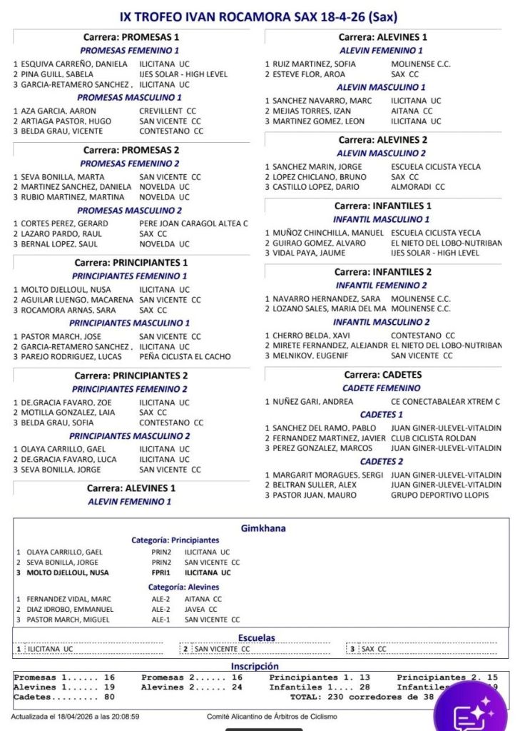 18/04 Trofeo de Escuelas de Ciclismo de Sax. Clasificaciones